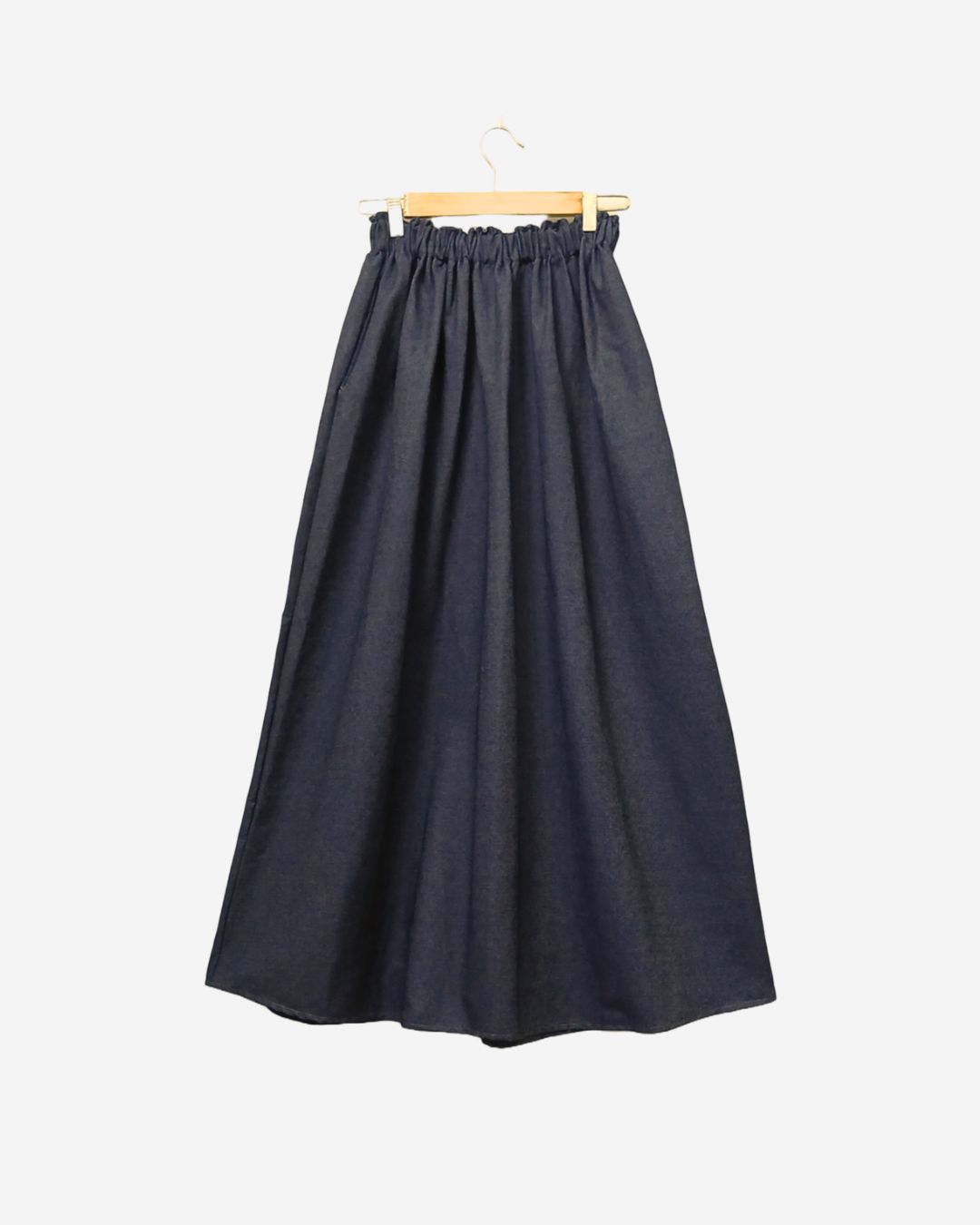 Classic black modest denim skirt, soft, flowy, and easy to wear with an elastic waist and side pockets.