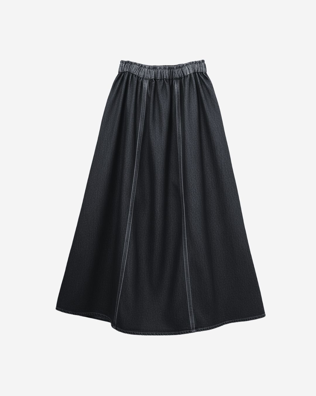 Black denim modest skirt with wide fit, elastic waistband, and practical side pockets.