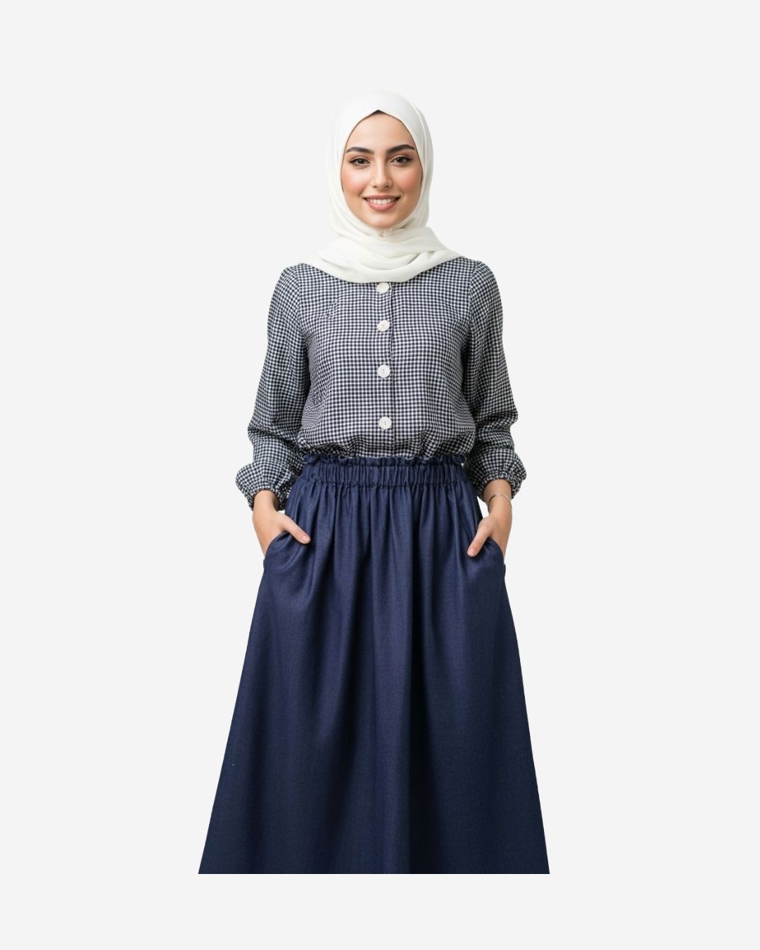 A refined modest set that balances comfort and style. The set includes a classic checkered linen blouse with beige buttons and gathered cuffs, paired with a dark denim skirt that has an elastic waist and hidden side pockets. Together, they create a chic modest look suitable for work, outings, or relaxed gatherings. The skirt length: 100 cm.