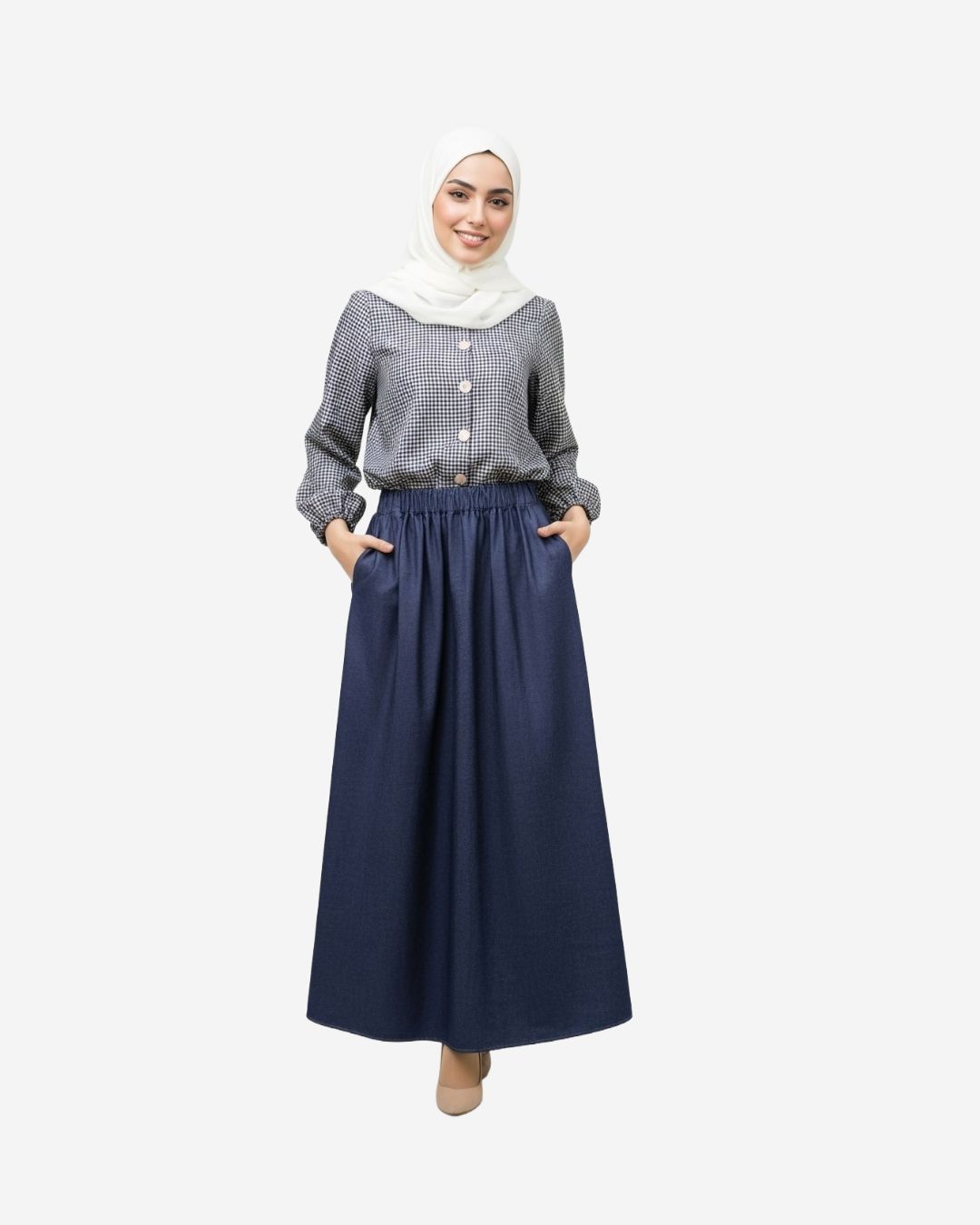 Elegant denim outfit featuring a checkered linen blouse and a dark denim modest skirt, perfect for work or casual days.