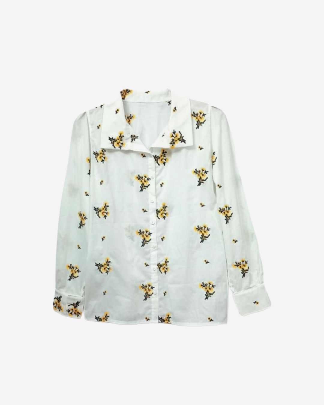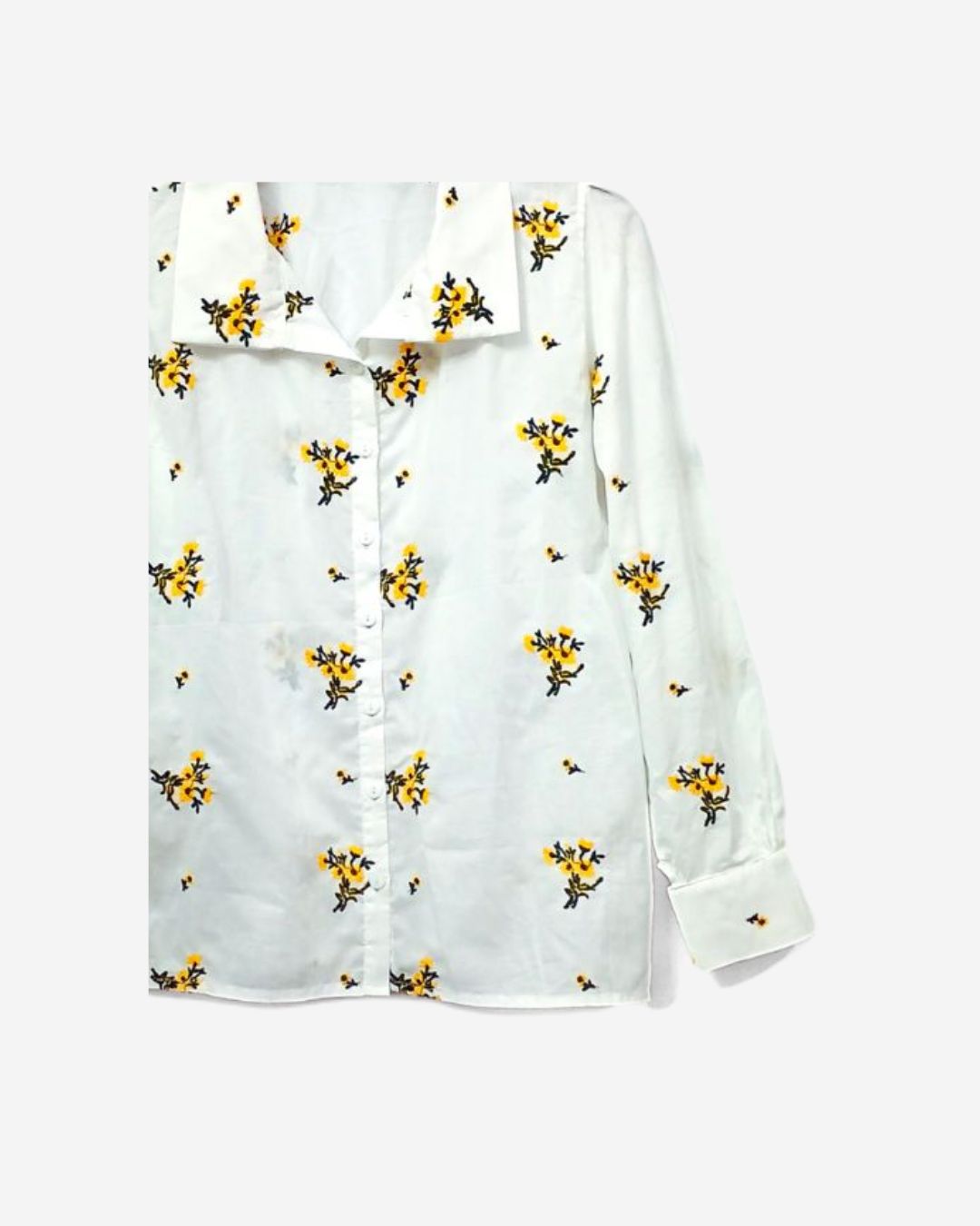 Off white embroidered cotton modest blouse with yellow and green thread details. Elegant embroidery adds a unique handmade touch.