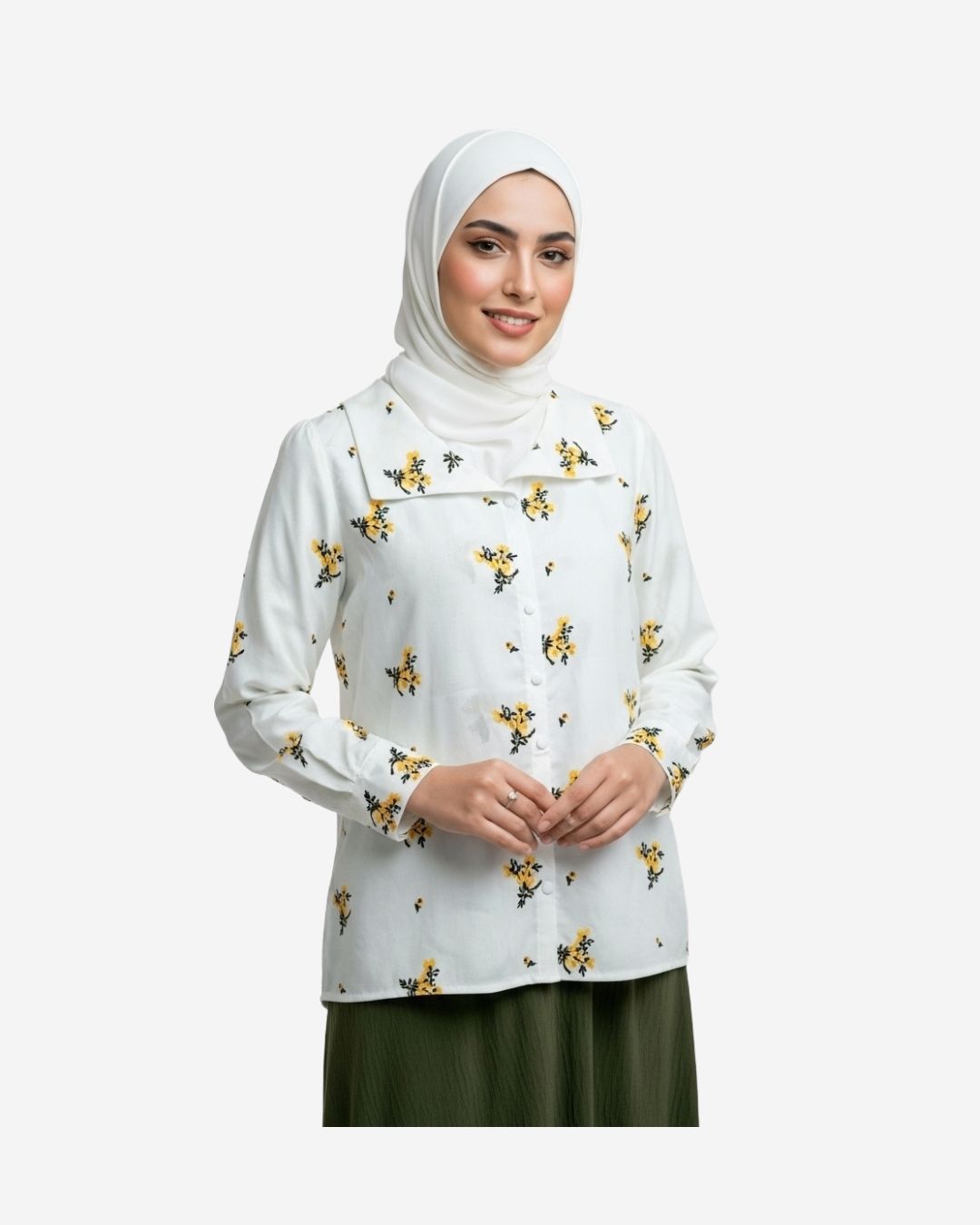 The Asmaa Basha Embroidered Off White Cotton Modest Grace Blouse features delicate hand-style embroidery in yellow and green tones that elevate a classic cotton silhouette. Soft breathable fabric and a relaxed fit make it a standout modest piece for special occasions or refined everyday looks. Pair with solid skirts to highlight the embroidery.